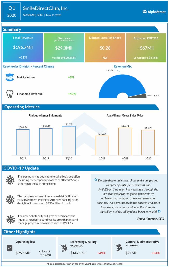Also, SmileDirectClub has entered into a new debt facility with HPS Investment Partners. After refinancing the previous debt facility, the company will have about $420 million in cash on its balance sheet, giving the liquidity needed to continue its growth plans and manage potential downsides with COVID-19.