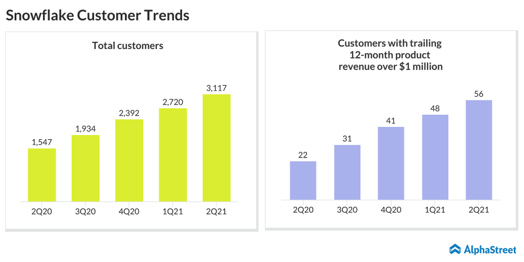 Snowflake platform is used globally by organizations of all sizes across a broad range of industries. As of July 31, 2020, the company had 3,117 customers, increasing from 1,547 customers as of July 31, 2019. As of July 31, 2020, customers included seven of the Fortune 10 and 146 of the Fortune 500 companies. The number of customers that contributed more than $1 million in trailing 12-month product revenue increased from 22 to 56 as of July 31, 2019 and 2020, respectively.
