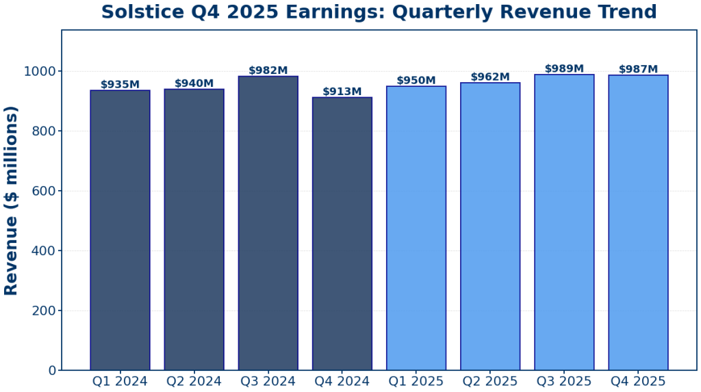 - Solstice Q4 2025 earnings beat expectations with 8% revenue growth to $987 million.