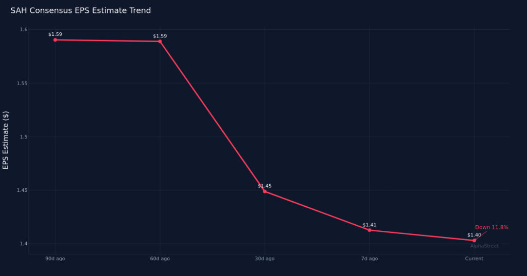 Wall Street expectations. Sonic Automotive (SAH) faces a consensus EPS estimate of $1.40 for its first quarter of fiscal 2026, according to nine analysts covering the automotive dealership operator. Revenue is expected to reach $3.73B, with analyst projections ranging from $3.63B to $3.90B. The EPS forecast range spans $1.08 to $1.62, reflecting meaningful disagreement among analysts about the company’s near-term profitability trajectory.