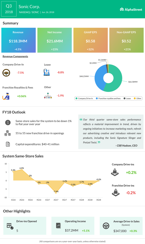 Sonic guided adjusted earnings in line with consensus estimates for fiscal 2018 in the range of $1.45 and $1.49 per share, which included the effect of tax reform. However, the earnings per share guidance was narrowed from the earlier guidance provided a month ago of $1.43 and $1.50. System same-store sales is expected to be down 1% to flat year-over-year for fiscal 2018.