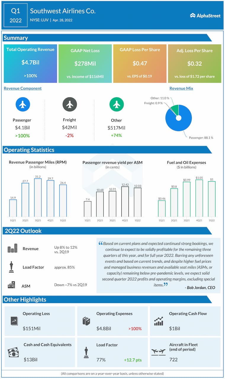 Southwest Airlines Co. (NYSE: LUV) reported operating revenues of $4.7 billion for the first quarter of 2022. This compares to $2 billion in the same period a year ago. Revenues were down 8.8% compared to Q2 2019.