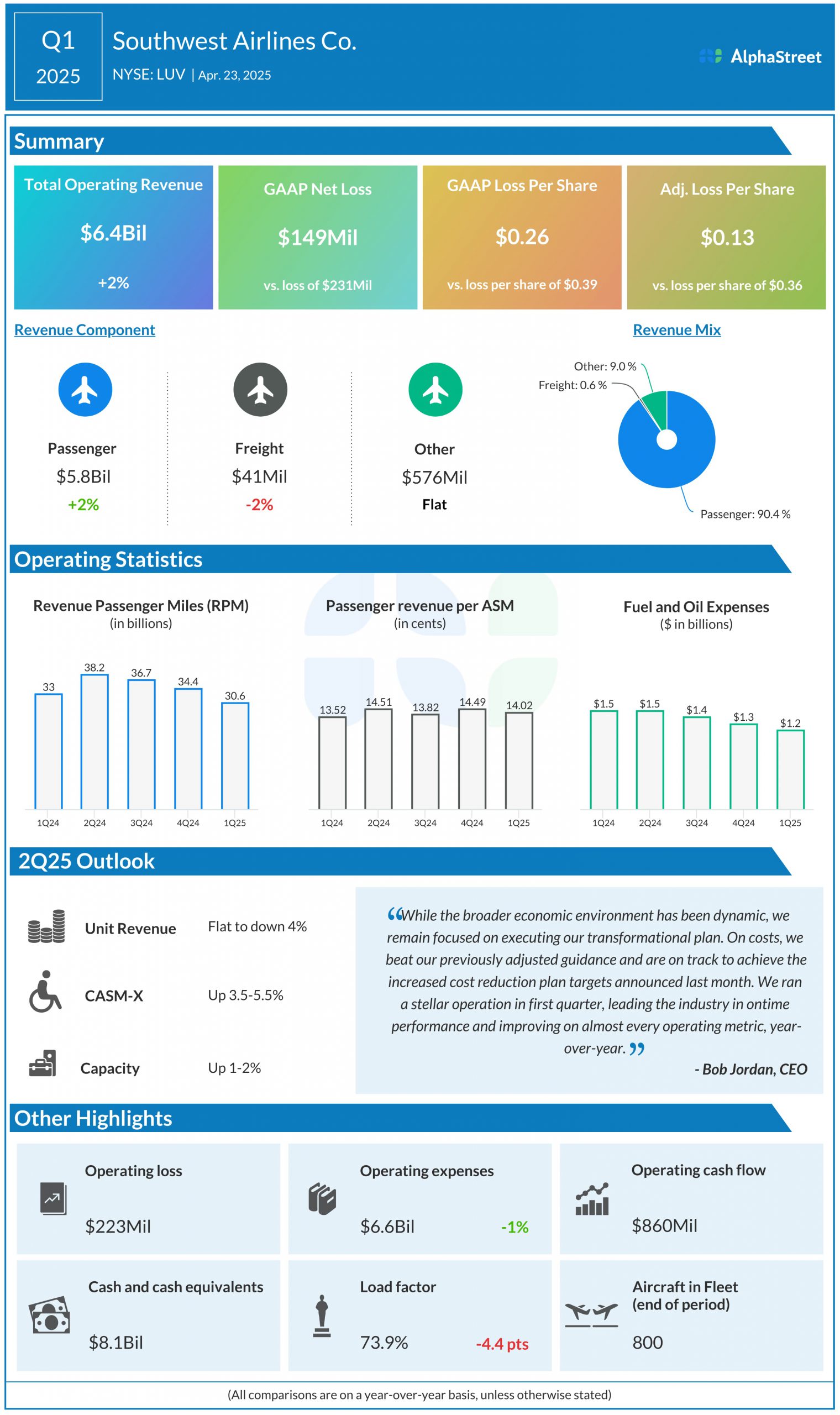 Southwest Airlines Co. (NYSE: LUV) reported total operating revenues of $6.4 billion for the first quarter of 2025, up 1.6% year-over-year.