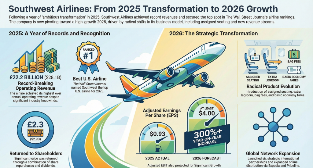 The Dallas-based airline, which is undergoing its most significant business model transformation in 54 years, has seen its stock trend upward in early 2026 after underperforming the broader market for much of the prior year. The shares are currently trading near the top of their 52-week range following the launch of assigned seating and extra-legroom options.