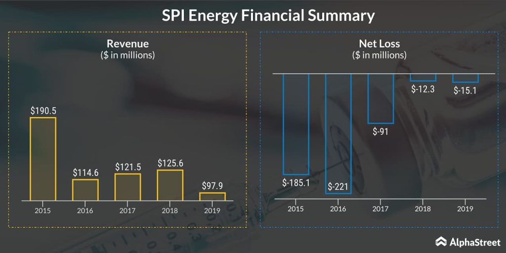 For the fiscal year ended December 31, 2019, SPI Energy’s loss expanded to $15.1 million from the $12.3 million in 2018. Revenue decreased to $97.9 million in 2019 from $125.6 million in 2018. SPI Energy had a working capital deficit of $113.5 million as of December 31, 2019.