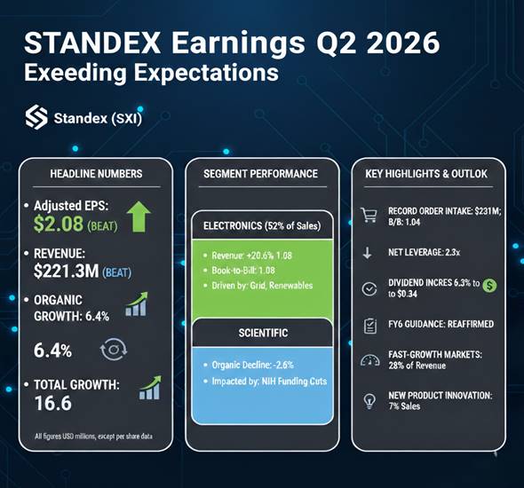 Standex International Corporation (NYSE: SXI) reported second-quarter fiscal 2026 financial results that exceeded analyst expectations for both earnings and revenue, bolstered by double-digit organic growth in its electronics division and the integration of recent acquisitions. The diversified industrial manufacturer posted adjusted diluted earnings per share of $2.08, outperforming the consensus estimate of $2.00. Revenue for the period ending December 31, 2025, rose 16.6% year-on-year to $221.3 million, marginally ahead of the $219.2 million anticipated by the market. Following the announcement, the company’s shares reached a new 52-week high, trading as high as $258.05 as investors responded to record order intake and a reaffirmed full-year outlook.