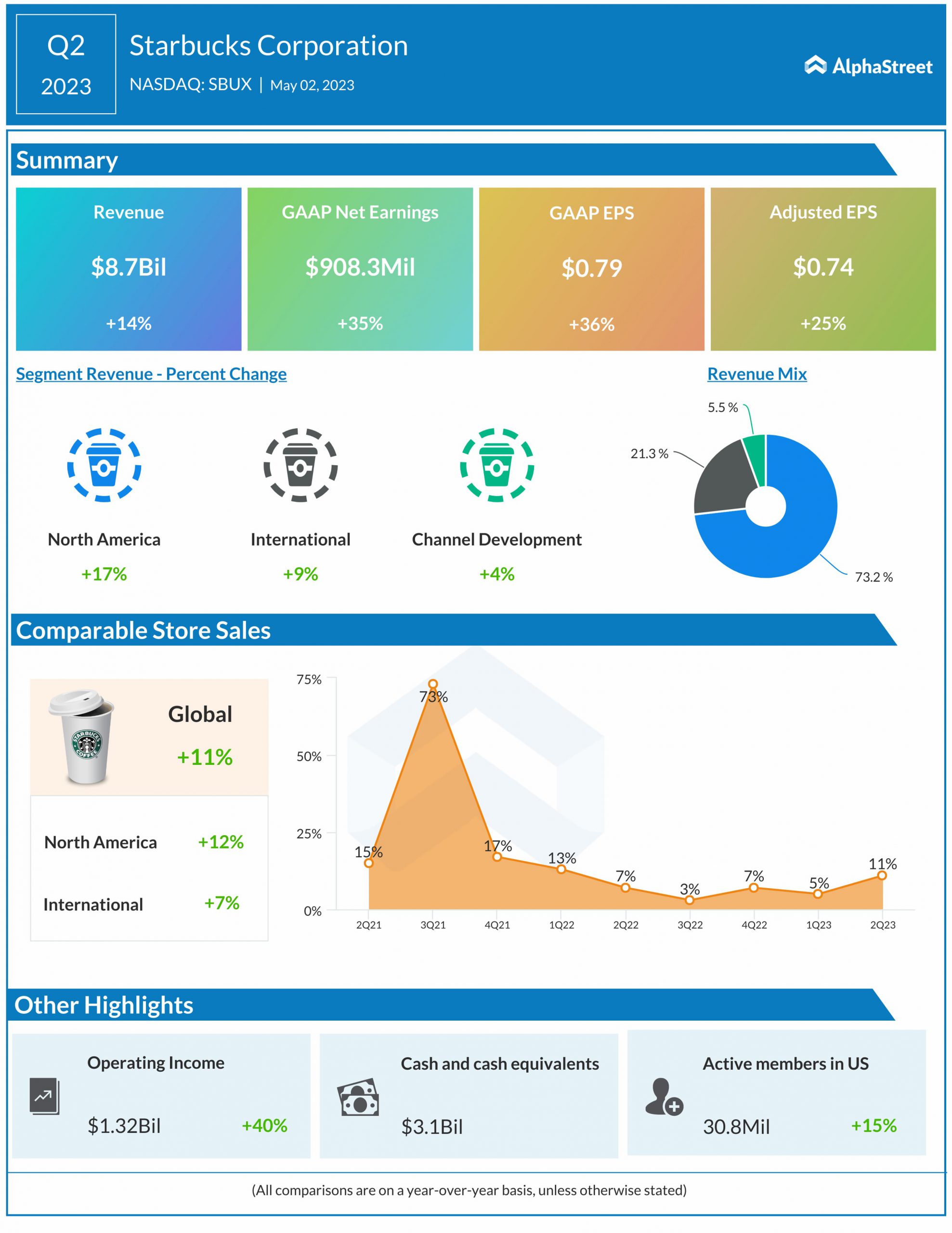 Starbucks generated revenues of $8.7 billion in the second quarter of 2023, which was up 14% from the year-ago period. Global comparable store sales rose 11%, driven by growth in comparable transactions and average ticket. Revenues increased across all divisions while comp sales rose in both the North America and international segments. GAAP EPS grew 36% to $0.79 while adjusted EPS rose 25% to $0.74.