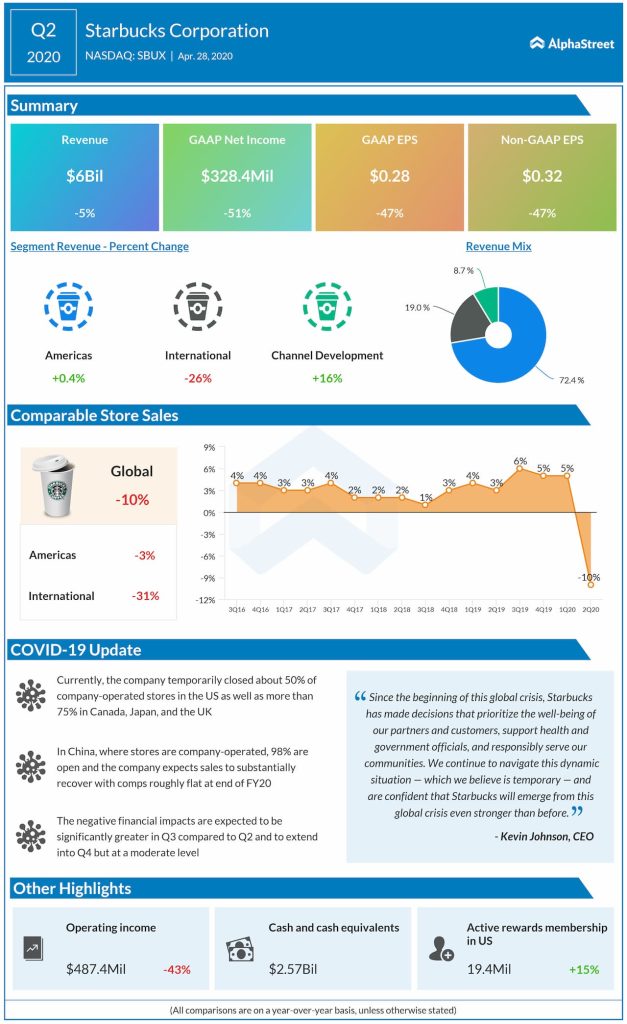 Starbucks posted a 51% dip in earnings for the second quarter of 2020 as the adverse impact of COVID-19 hurt the top-line by 5%. Global comparable-store sales fell 10% due to a 13% decrease in comparable transactions that were partially offset by a 4% rise in average ticket. The company experienced lost sales arising from the COVID-19 that include the effects of temporary store closures, modified operations, reduced hours, and reduced customer traffic.
