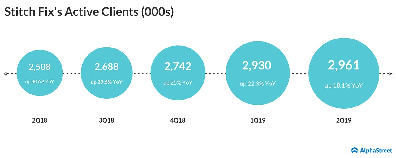 Active clients grew 18% year-over-year to 3 million for the quarter ended January 26, 2019. The subscription-based styling service firm projected Q2 active client count to be relatively flat quarter-over-quarter in Q2.