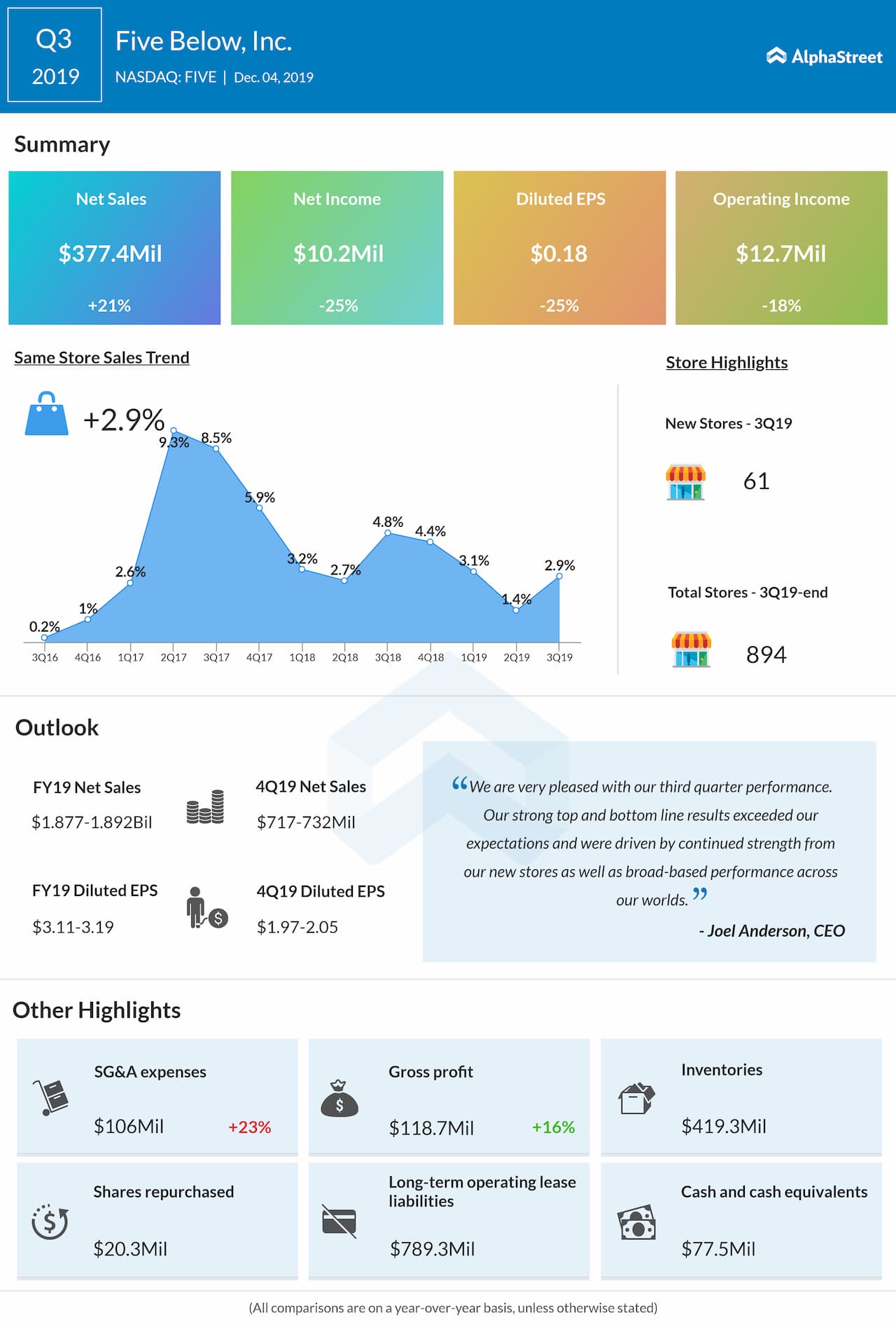 A few months ago, the market responded positively after Five Below reported stronger-than-expected earnings for the third quarter, despite a double-digit decline. Sales, meanwhile, increased 21% annually to $377.4 million and topped the Street view. The company this week said it is on track to open 180 new stores in 2020, as initially planned, and to roll out Ten Below zones in select outlets.