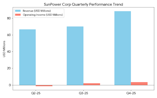 SunPower reported record consolidated revenue of $88.5 million for the fourth quarter ended December 31, 2025. This represents a 26.4% sequential increase from the $70.0 million recorded in the third quarter of 2025. Preliminary non-GAAP operating income reached $3.55 million, compared to $2.02 million in the prior period.
