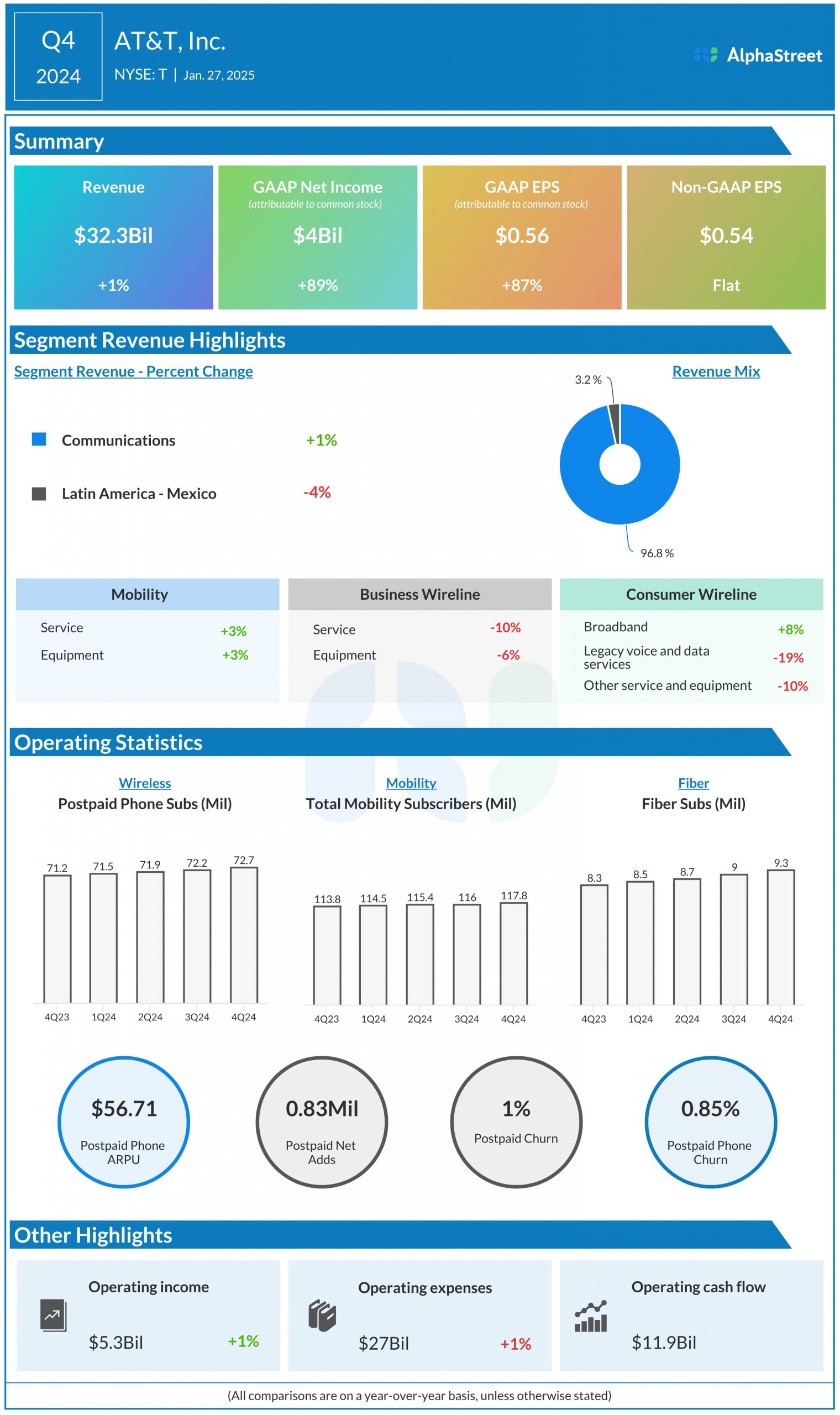 Revenues totaled $32.3 billion, up 0.9% from the year-ago quarter, driven by higher Mobility service and equipment revenues and Consumer Wireline revenues, partially offset by declines in Business Wireline and Mexico.