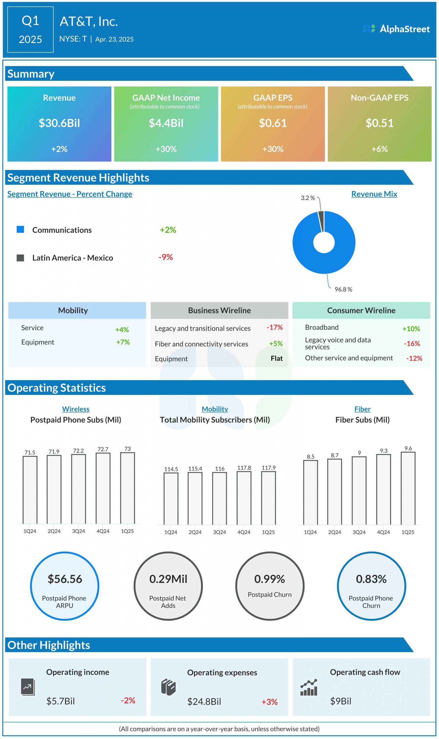 Revenues were $30.6 billion, up 2% year-over-year, helped by higher Mobility and Consumer Wireline revenues, partly offset by declines in Business Wireline and Mexico.