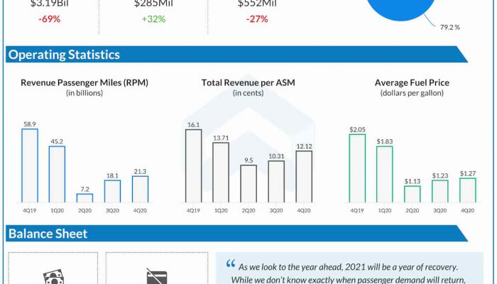 United Airlines Holdings, Inc. (NYSE: UAL) reported fourth quarter 2020 earnings results today. Total operating revenues declined 69% year-over-year to $3.4 billion.