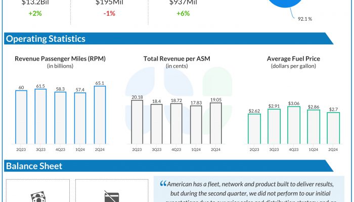 American Airlines Group Inc. (NASDAQ: AAL) reported its second quarter 2024 earnings results today. Total operating revenues increased 2% year-over-year to $14.3 billion.