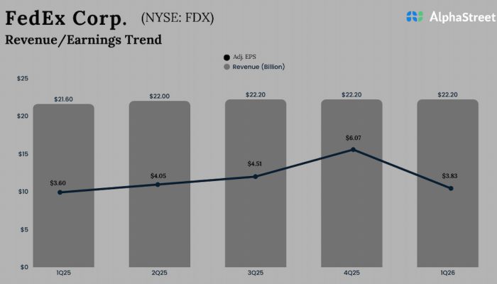Cargo giant FedEx Corp. (NYSE: FDX) on Thursday reported higher revenues and adjusted earnings for the first quarter of fiscal 2026. Earnings