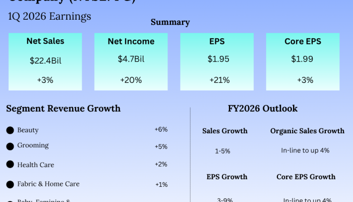 The Procter & Gamble Company (NYSE: PG) reported its first quarter 2026 earnings results today. Net sales were $22.4 billion, up 3%