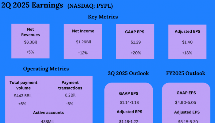 PayPal Holdings, Inc. (NASDAQ: PYPL) reported its second quarter 2025 earnings results today. Net revenues increased 5% year-over-year to $8.3 billion. Revenues