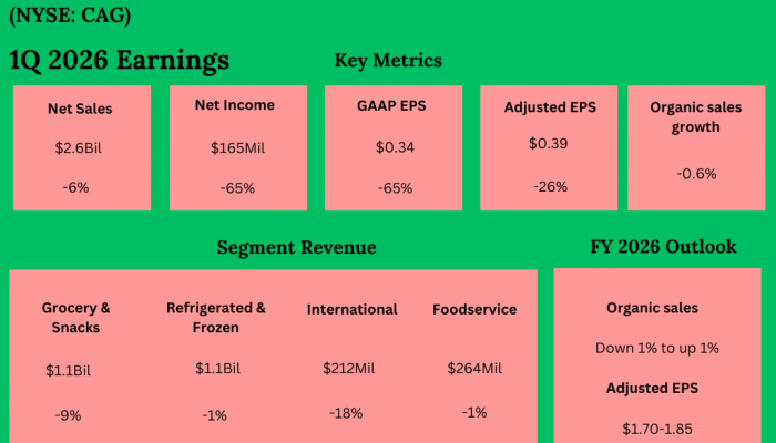 Conagra Brands, Inc. (NYSE: CAG) reported its first quarter 2026 earnings results today. Net sales decreased 5.8% year-over-year to $2.63 billion. Organic net