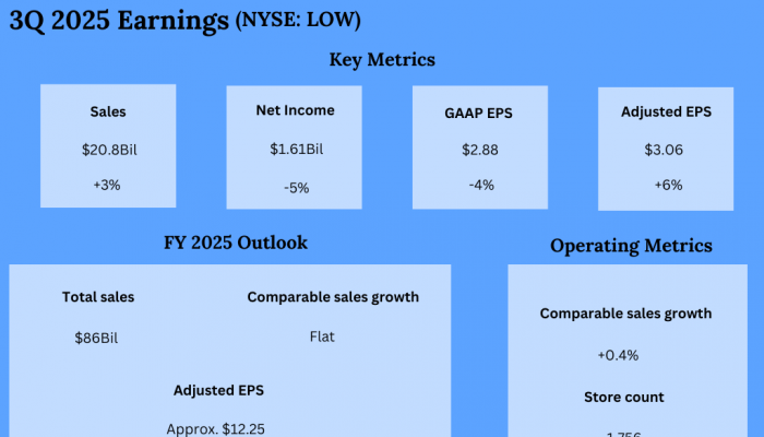 Lowe's Companies, Inc. (NYSE: LOW) reported its third quarter 2025 earnings results today. Total sales rose to $20.8 billion from $20.2 billion in the prior-year