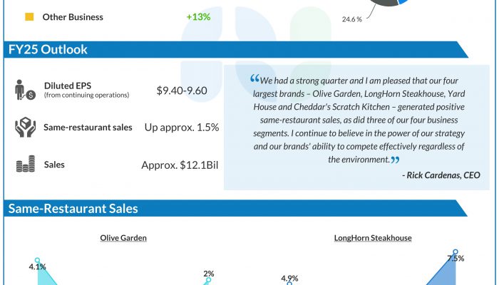 Darden Restaurants, Inc., (NYSE: DRI) reported its first quarter 2025 earnings results today. Total sales increased 1% to $2.8 billion compared to