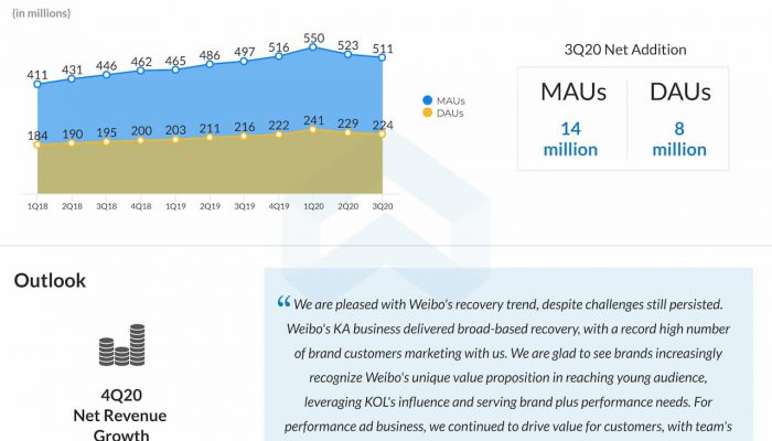 Weibo Corporation (NASDAQ: WB) reported third quarter 2020 earnings results today. Net revenues remained relatively flat year-over-year at $465.7 million but dropped