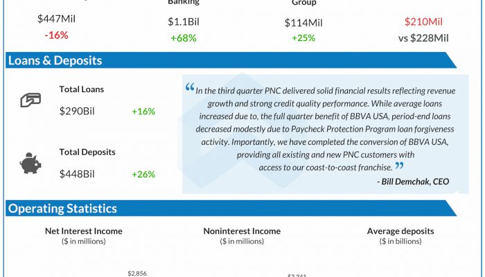 The PNC Financial Services Group, Inc. (NYSE: PNC) reported third-quarter 2021 earnings results today. Revenues were up 21% year-over-year to $5.1 billion