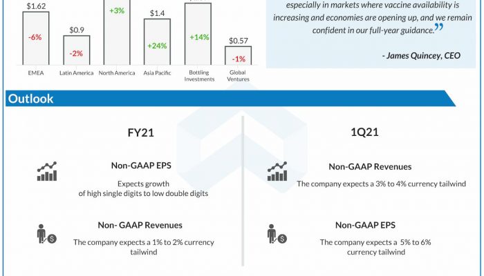 The Coca-Cola Company (NYSE: KO) reported first-quarter 2021 financial results before the regular market hours on Monday. The beverage manufacturer reported fourth-quarter
