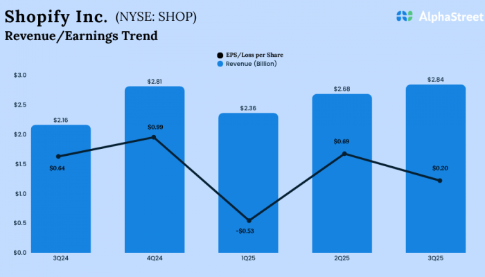 Shopify Inc. (NASDAQ: SHOP) reported its third quarter 2025 earnings results today. Revenue increased 32% year-over-year to $2.84 billion. Net income was