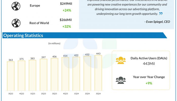 Snap Inc. (NYSE: SNAP) reported earnings results for the third quarter of 2024. Net revenues were $1.37 billion, up 15% year-over-year. Net