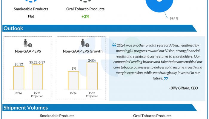 Altria Group, Inc. (NYSE: MO) reported its fourth quarter 2024 earnings results today. Net revenues remained flat at $5.9 billion compared to
