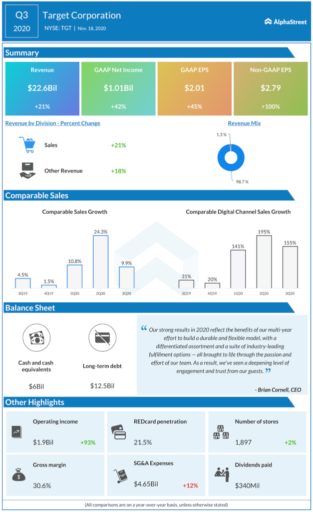 Target Corporation (NYSE: TGT) reported third-quarter 2020 financial results before the regular trading hours on Wednesday. The department store chain reported Q3 revenue of $22.6 billion, up 21% year-over-year and higher than the Wall Street projection. Meanwhile, net income of $2.79 per share was much better than what analysts had anticipated.