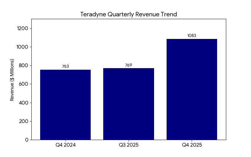 Teradyne reported consolidated revenue of $1.083 billion for the fourth quarter of 2025, representing a 44% increase compared to the fourth quarter of 2024. GAAP net income for the period was $257.2 million, a 75.8% increase from $146.3 million in the prior-year quarter. Segment results for the quarter included $883 million from Semiconductor Test, $110 million from Product Test, and $89 million from Robotics. The growth in the Semiconductor Test division was attributed to demand in compute, networking, and memory sectors.