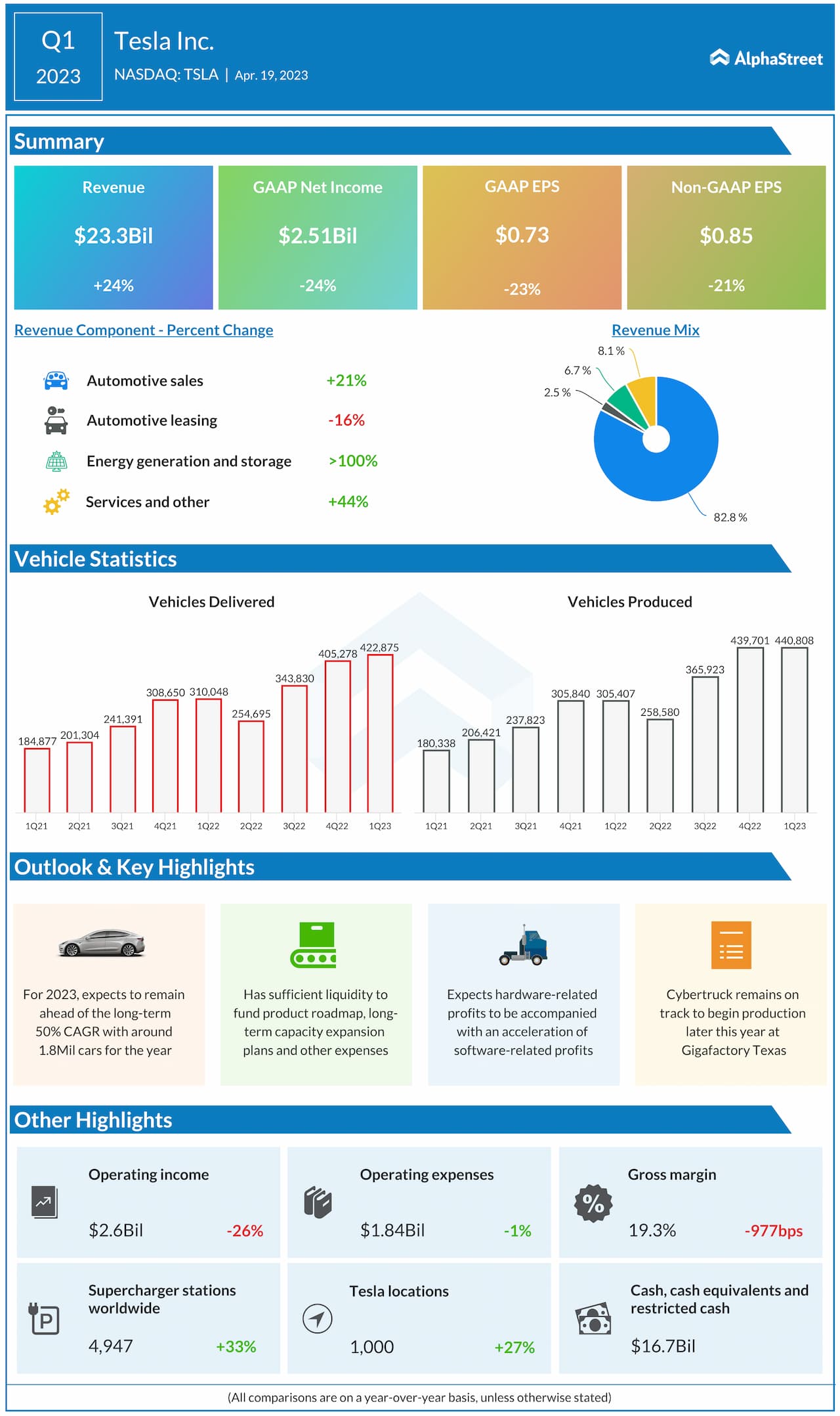 In the first quarter, adjusted earnings missed estimates for the first time in two years as pricing pressures weighed on margins. At $0.85 per share, first-quarter profit was also 21% lower than the prior-year number. Meanwhile, revenues increased 24% to $23.3 billion but fell short of expectations, marking the third miss in a row. Automotive Sales and Services & Other expanded in double digits while energy segment revenues more than doubled, which was partially offset by a contraction in Automotive Leasing. Both production and deliveries climbed to new highs.