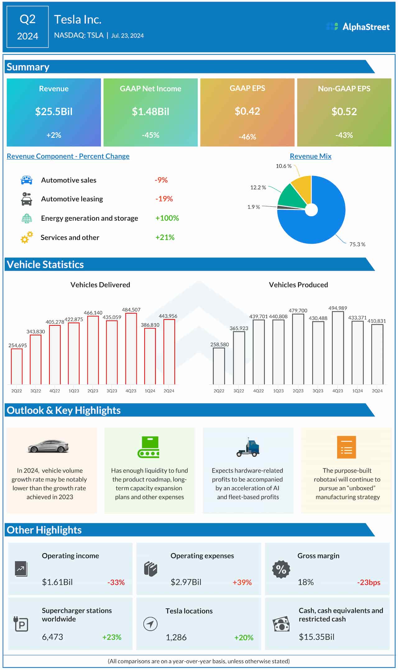 The electric car giant said its second-quarter revenues increased 2% year-over-year to $25.5 billion. Revenues exceeded estimates. The company produced a total of 410,831 vehicles during the three months and delivered 443,956 units.