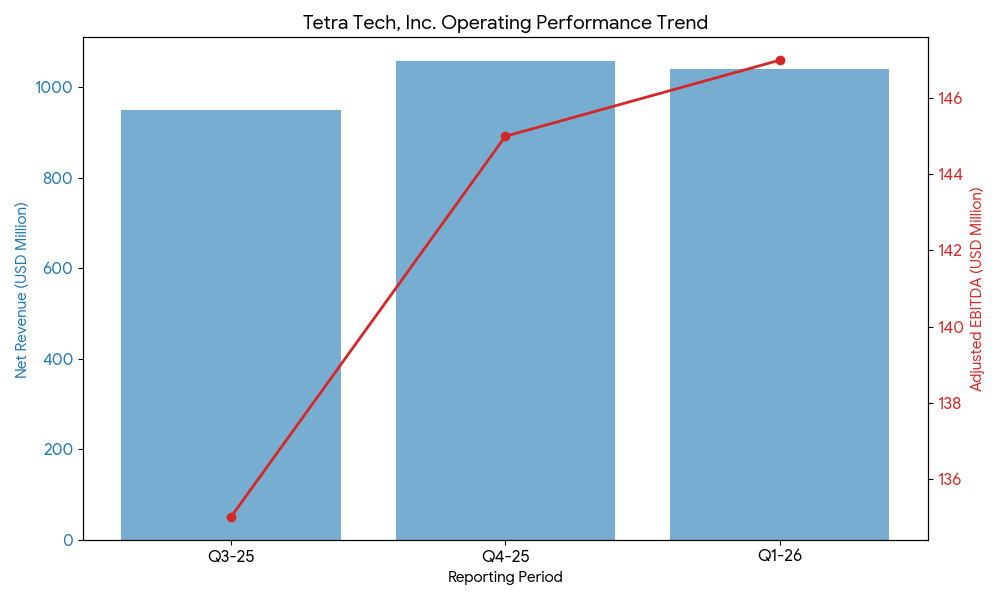 For the first quarter of fiscal year 2026, Tetra Tech reported consolidated revenue of $1.21 billion. Net revenue, which excludes subcontractor costs, was $1.04 billion, representing an 8% increase compared to the same period in the prior year, after adjusting for certain one-time contracts and hurricane-related work. Net profit for the period was reported with a GAAP earnings per share (EPS) of $0.40. Adjusted EPS for the quarter was $0.35, compared to $0.35 in the first quarter of fiscal 2025. Adjusted EBITDA rose to $147 million from $129 million in the prior-year period.