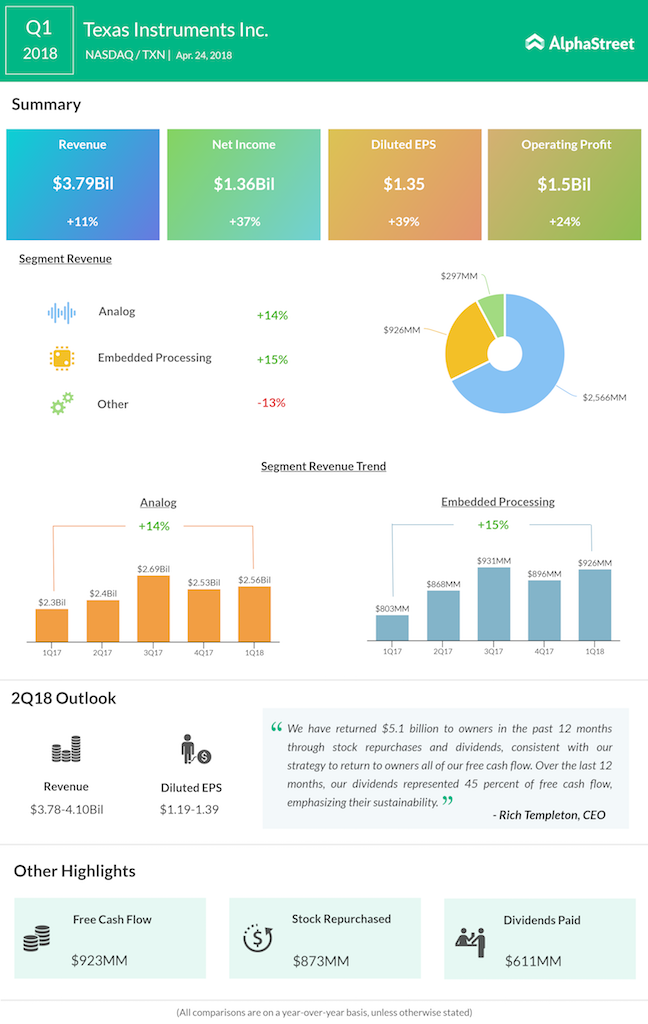 Semiconductor company Texas Instruments (TXN) reported top and bottom line results that topped consensus estimates for the first quarter of 2018, with revenue increasing 11.3% to $3.79 billion, aided by continued demand for the company’s Analog and Embedded Processing products in the industrial and automotive markets. Earnings spiked 37% to $1.36 billion with EPS jumping 39% to $1.35. The higher profit was aided by higher sales and operating income.