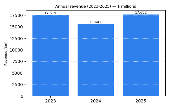 Annual revenue: $17,682 million in 2025 versus $15,641 million in 2024. Directional trend: growth.