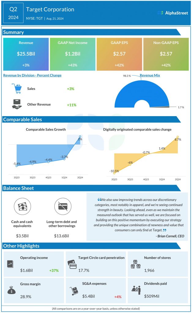 For the third quarter of 2024, Target expects a 0-2% increase in comparable sales. GAAP and adjusted EPS are both expected to range between $2.10-2.40.