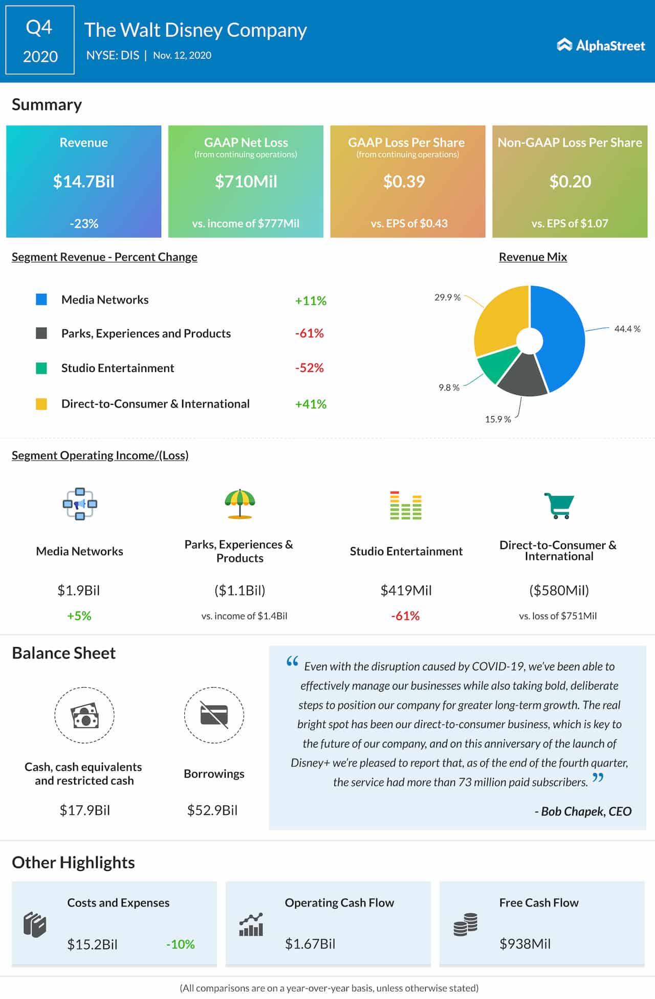 The low point is that the Parks and Studio businesses continue to suffer. For the fourth quarter, the Parks, Experiences and Products segment saw a 61% drop in revenue while the Studio Entertainment segment posted a 52% decline versus the previous year.