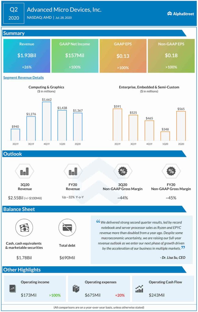 Advanced Micro Devices, Inc. (NASDAQ: AMD) reported better-than-expected earnings for the second quarter of 2020 as revenues climbed 26%, mainly reflecting strong performance by the Computing and Graphics segment.