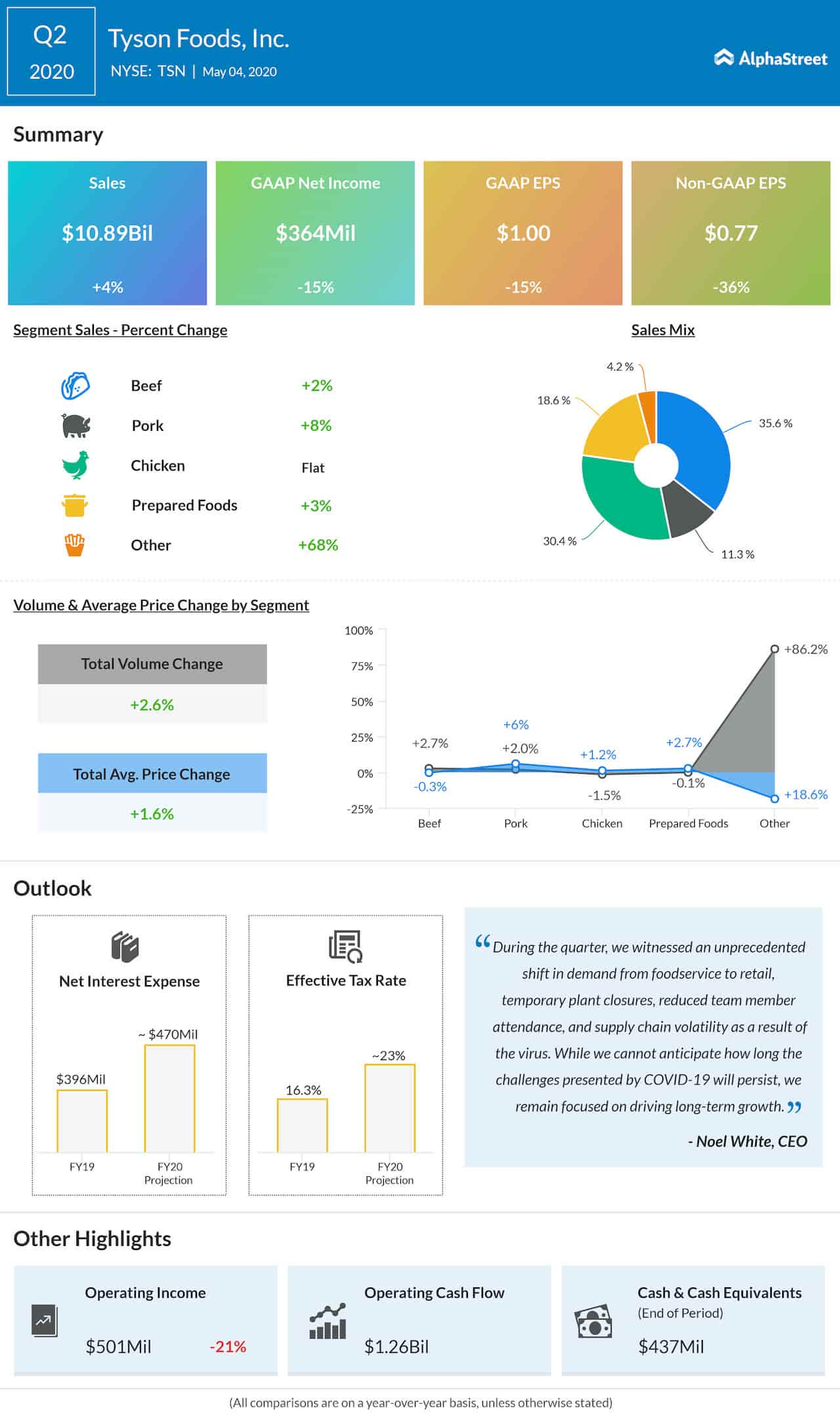Tyson faced many challenges during the quarter due to the coronavirus pandemic. The company had to halt production at some of its facilities and limit capacity at certain others due to a shortage in labor, leading to lower volumes.