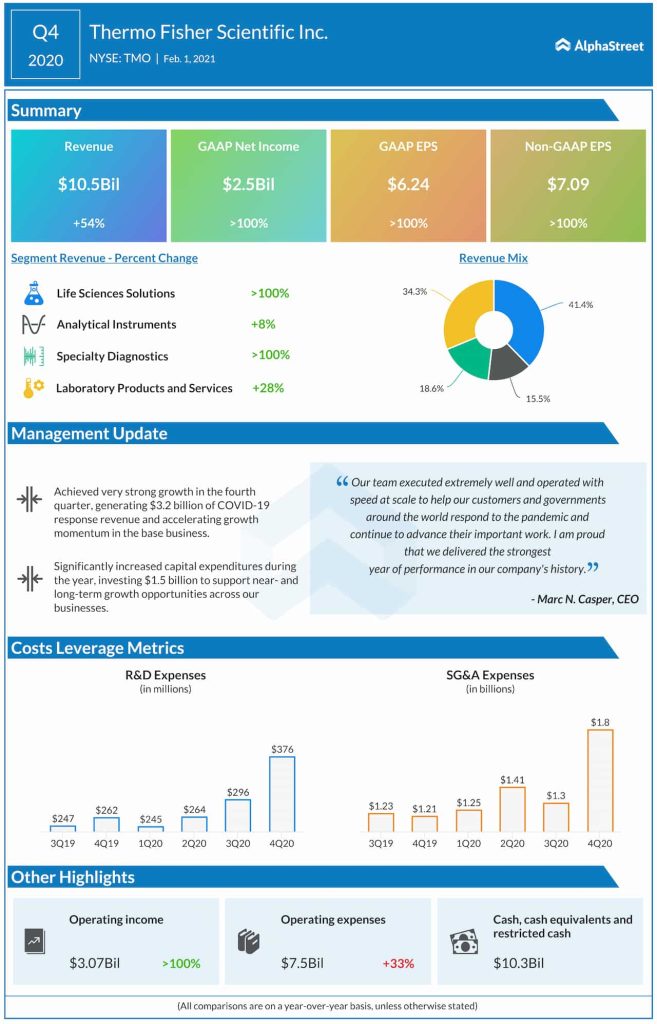 “Thermo Fisher Scientific Inc. (NYSE: TMO) reported fourth-quarter 2020 earnings results today. Revenue increased 54% year-over-year to $10.55 billion. GAAP earnings jumped 151% to $2.5 billion, or $6.24 per share, compared to $1 billion, or $2.49 per share, last year. Adjusted EPS increased 100% to $7.09.