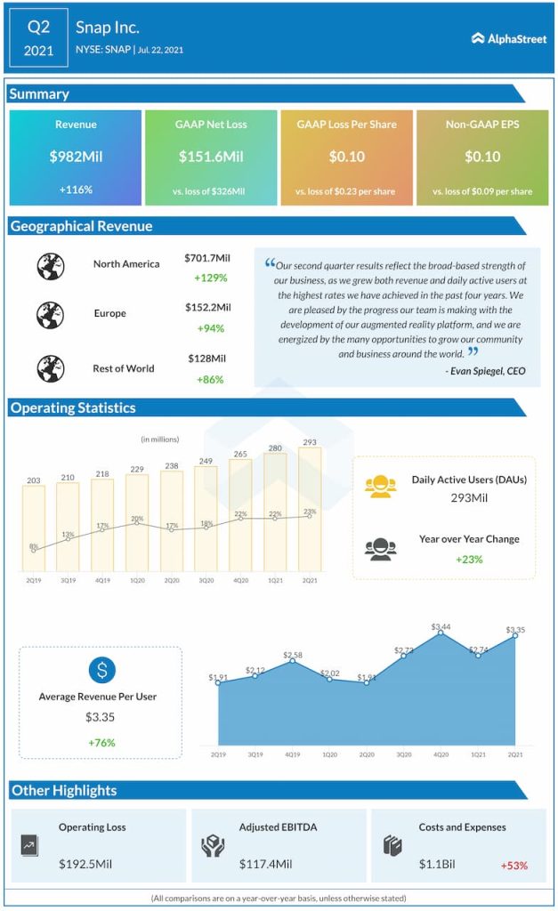 For the third quarter of 2021, Snap expects revenue to come in the range of $1.07-1.08 billion, reflecting a growth of 58-60% YoY.