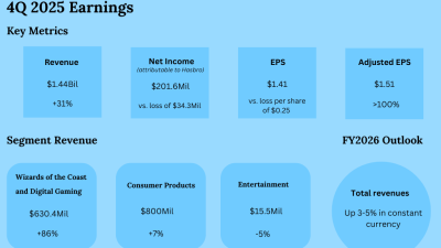 Hasbro, Inc. (NASDAQ: HAS) reported its fourth quarter 2025 earnings results today. Revenues increased 31% year-over-year to $1.44 billion. Net...