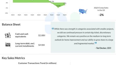 Home Depot (NYSE: HD) reported its second quarter 2023 earnings results today. Sales decreased 2% year-over-year to $42.9 billion but surpassed expectations. Comparable sales fell…