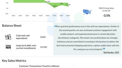 The Home Depot (NYSE: HD) reported third quarter 2023 earnings results today. Sales decreased 3% year-over-year to $37.7 billion. Comparable sales fell 3.1%. Net earnings…