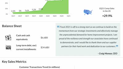 The Home Depot, Inc. (NYSE: HD) reported first-quarter 2021 earnings results today. Net sales increased 32.7% year-over-year to $37.5 billion. Comparable sales were a positive…