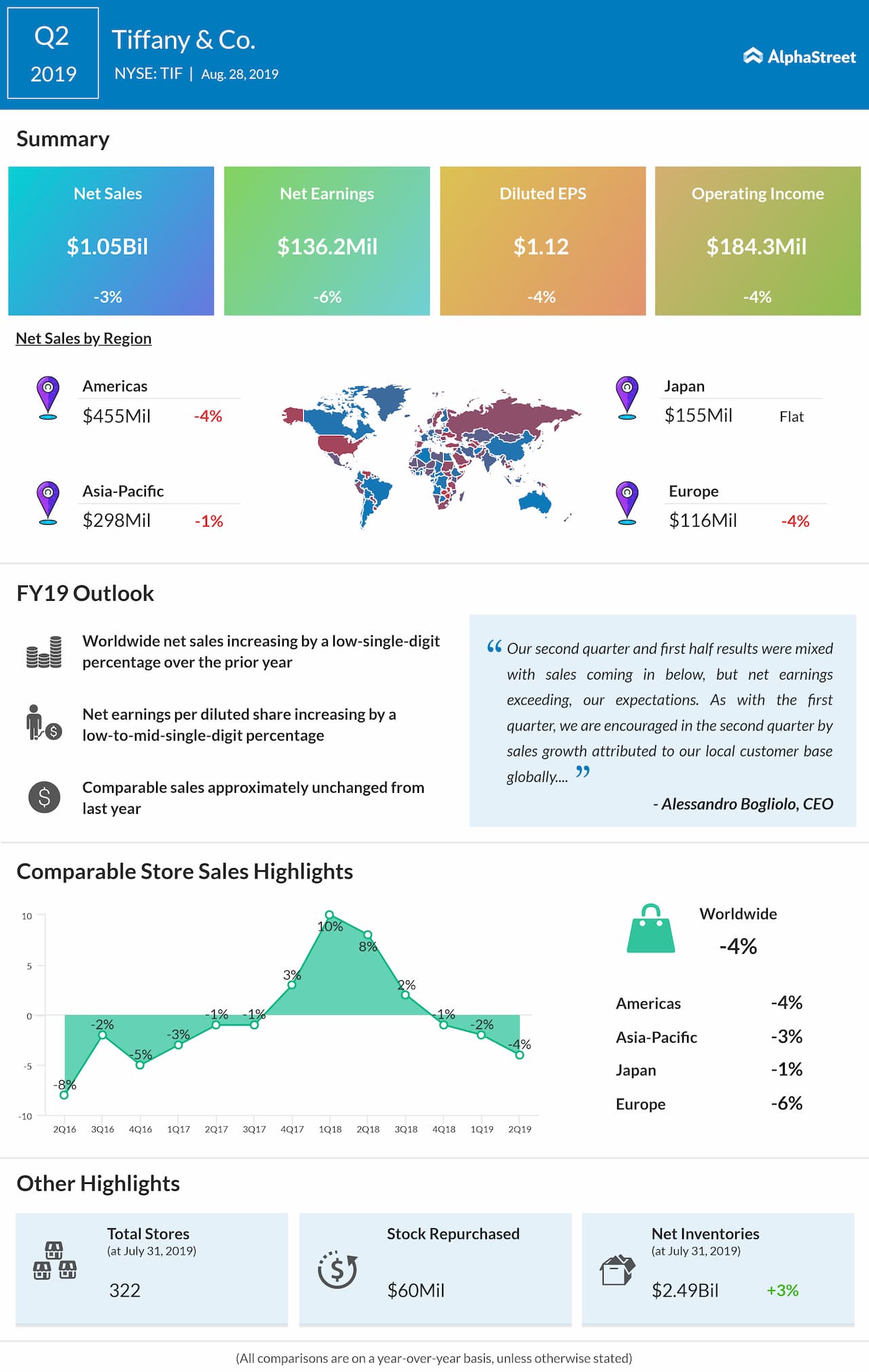 In the first half, Tiffany has opened three Company-operated stores and closed two. At July 31, 2019, the company operated 322 stores, out of which 124 in the Americas, 90 in Asia-Pacific, 56 in Japan, 47 in Europe, and five in the UAE.