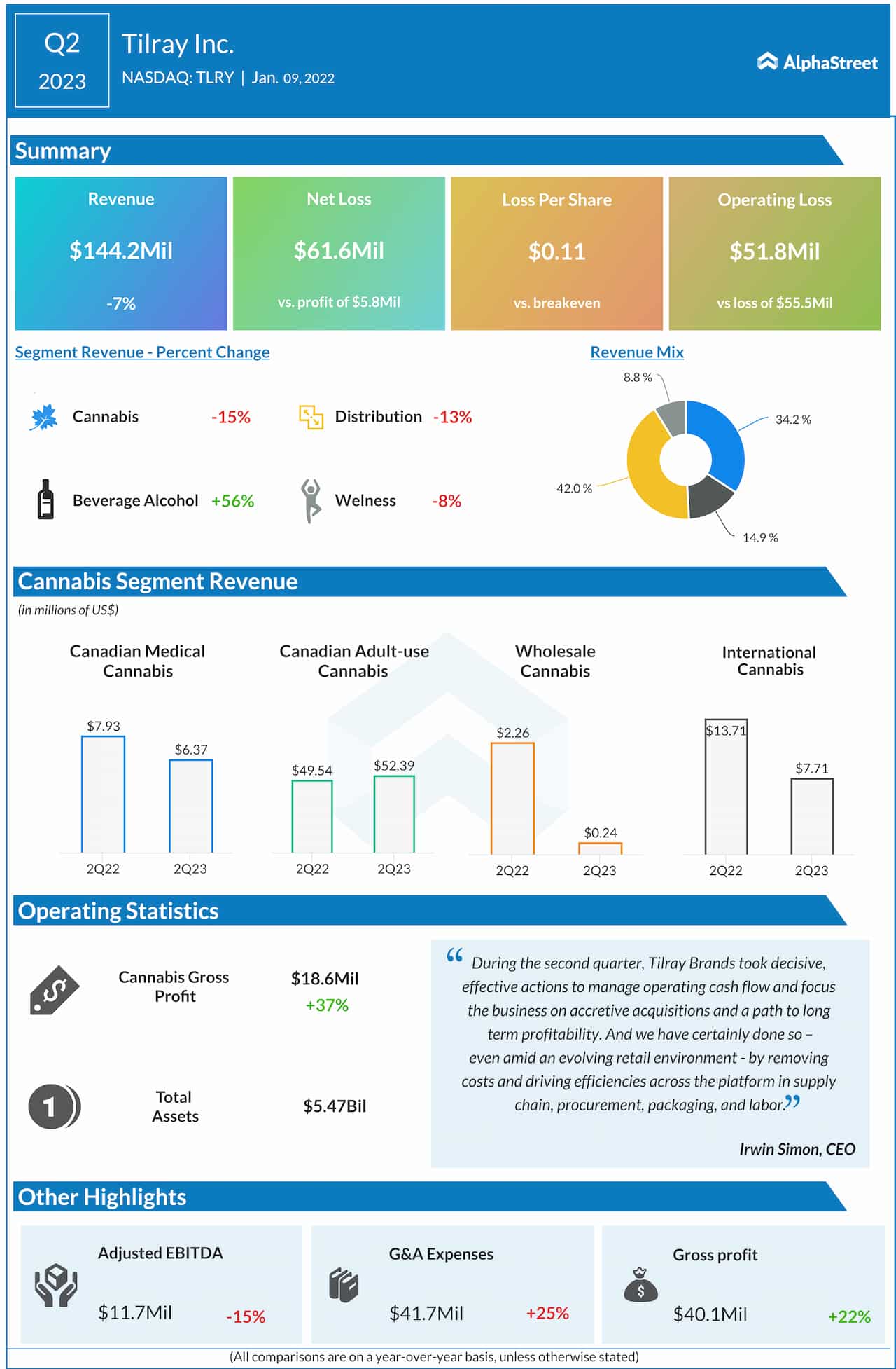 Cannabis company Tilray (NASDAQ: TLRY) has announced financial results for the second quarter of 2023, reporting a net loss and a 7% decrease in revenues.